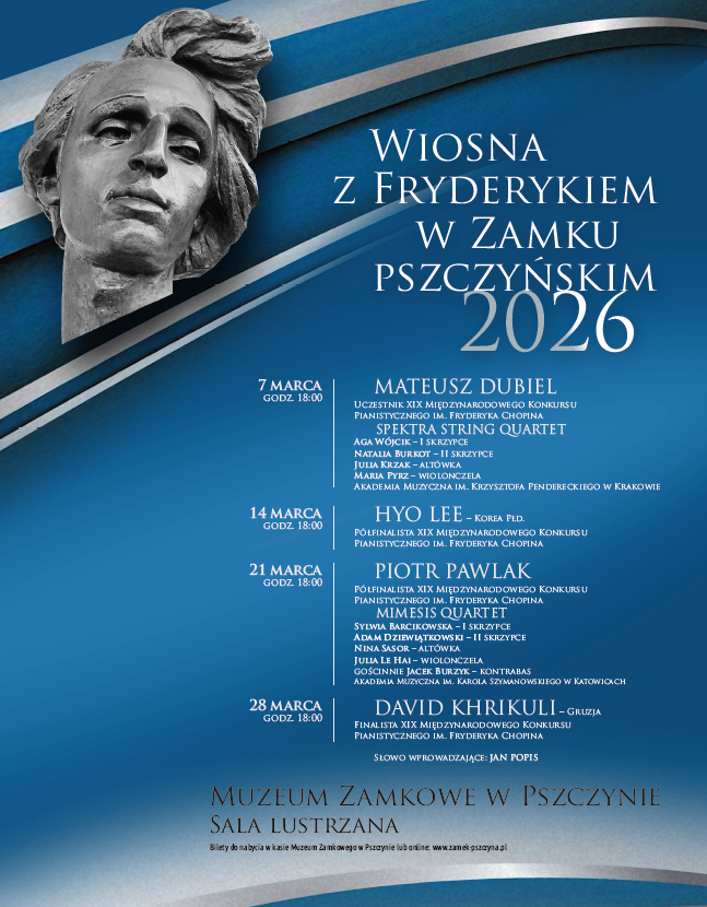 W 2015 roku w Sali Lustrzanej Muzeum Zamkowego w Pszczynie zainaugurowano cykl koncertów „Wiosna z Fryderykiem w Zamku pszczyńskim”, który od lat zachwyca melomanów i entuzjastów muzyki klasycznej. Jego głównym celem jest oddanie hołdu twórczości Fryderyka Chopina – jednego z najwybitniejszych kompozytorów w historii muzyki, którego dzieła nieprzerwanie inspirują i poruszają serca słuchaczy na całym świecie. Tegoroczna edycja cyklu „Wiosna z Fryderykiem” stanowi prawdziwą ucztę dla miłośników muzyki, pełną niezapomnianych wykonań, które na zawsze pozostaną w Państwa pamięci.